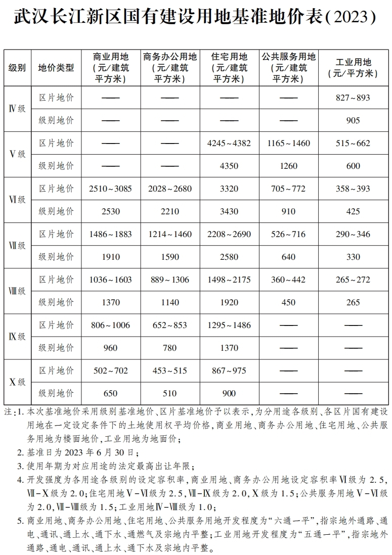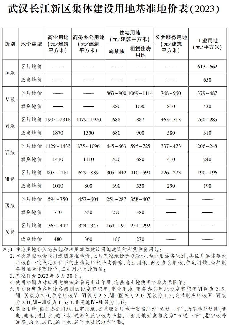 市人民政府关于实施武汉长江新区城乡建设用地基准地价标准(2023)的通知